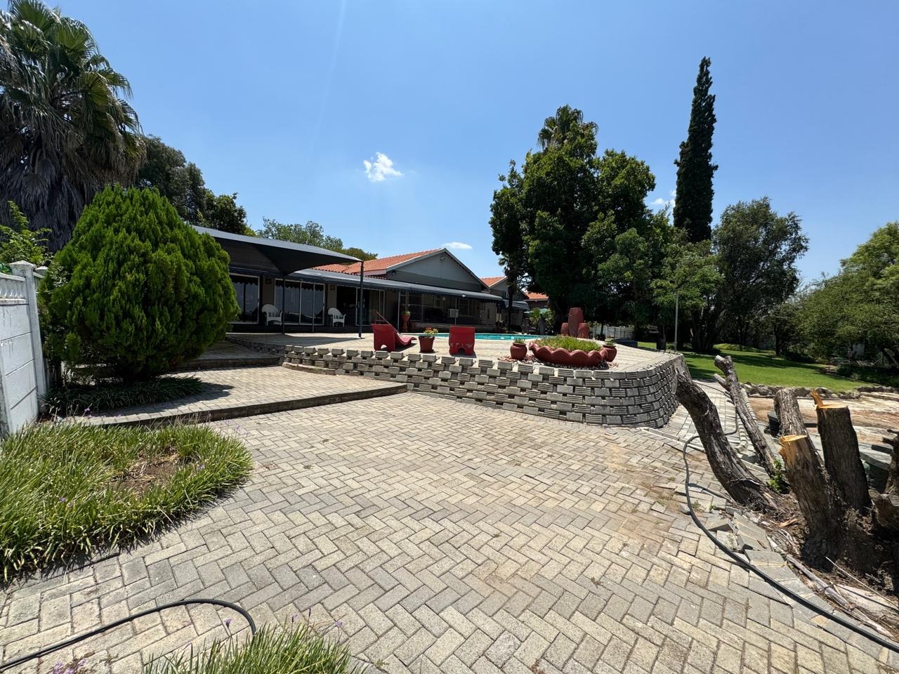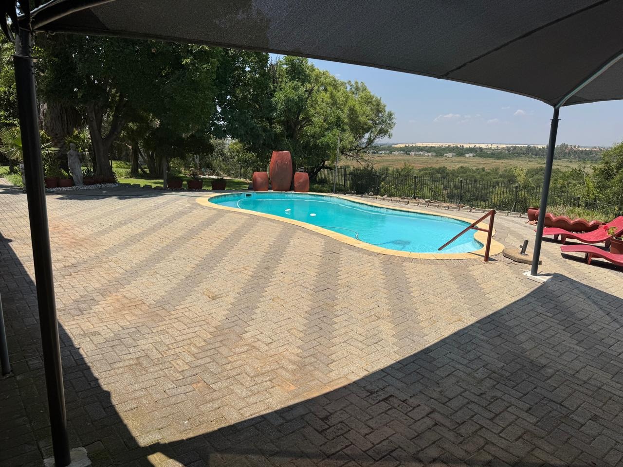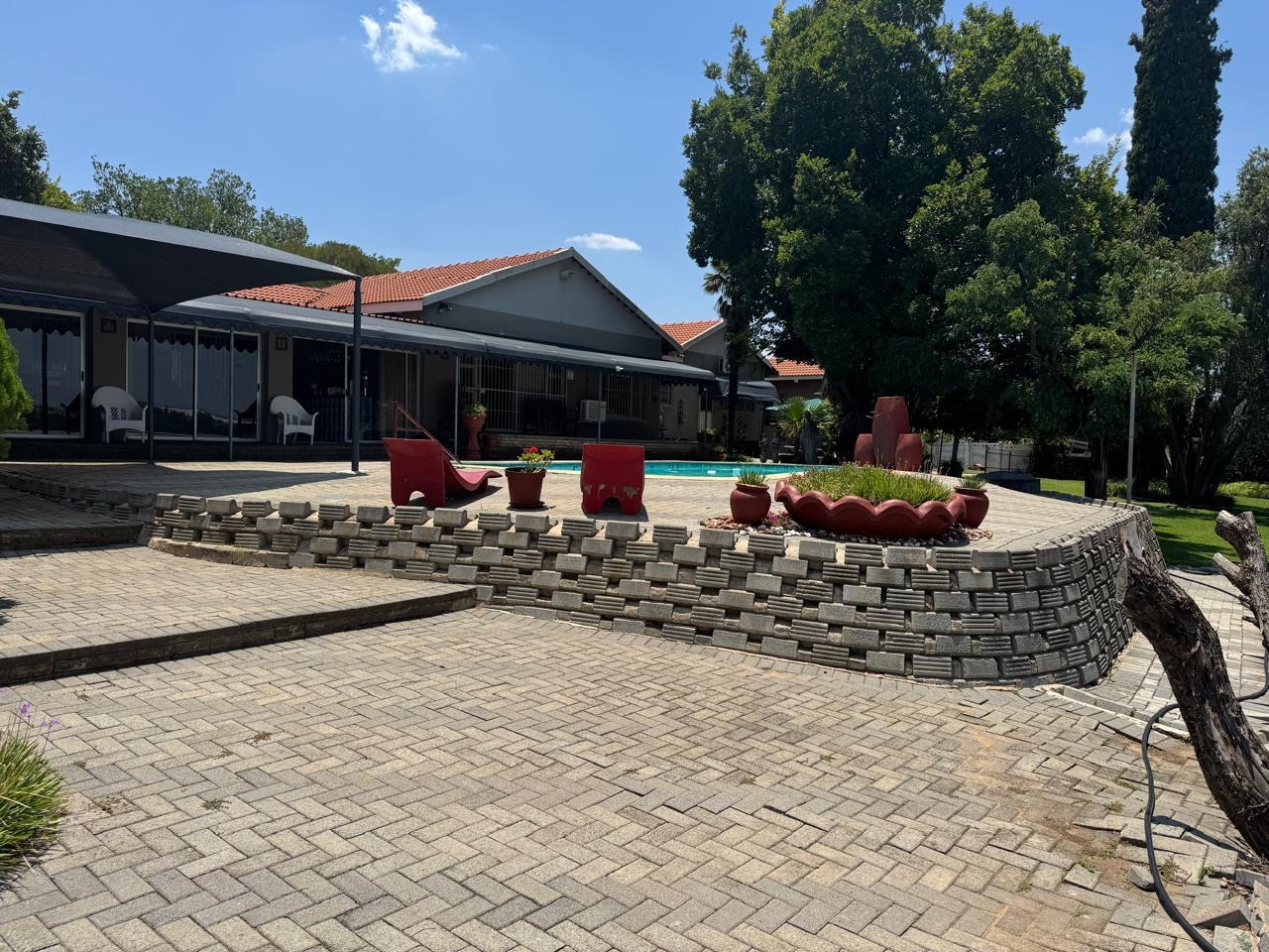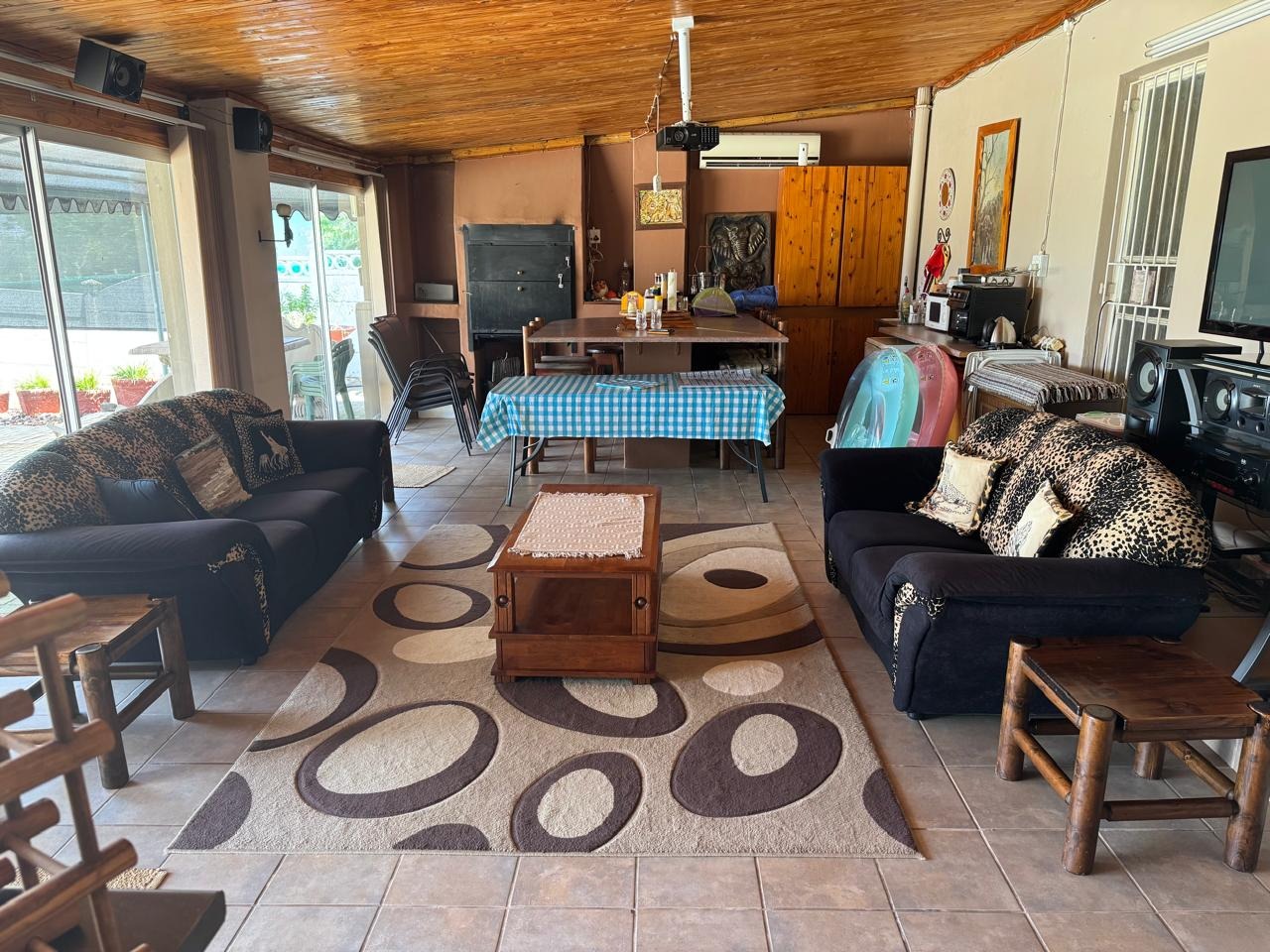 An entertainment room with a bar and indoor braai opens through sliding doors to a sparkling swimming pool.