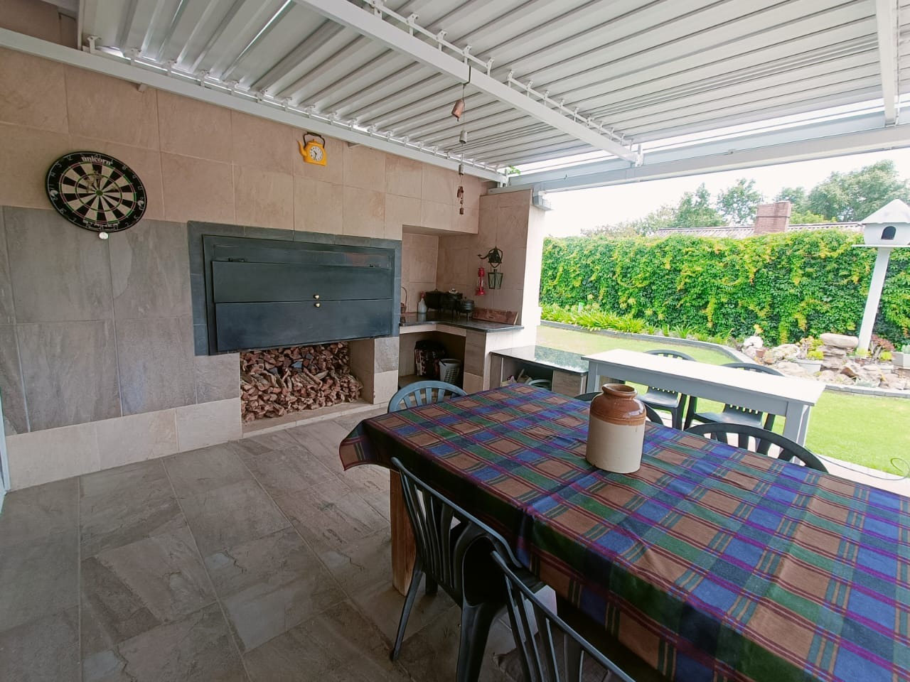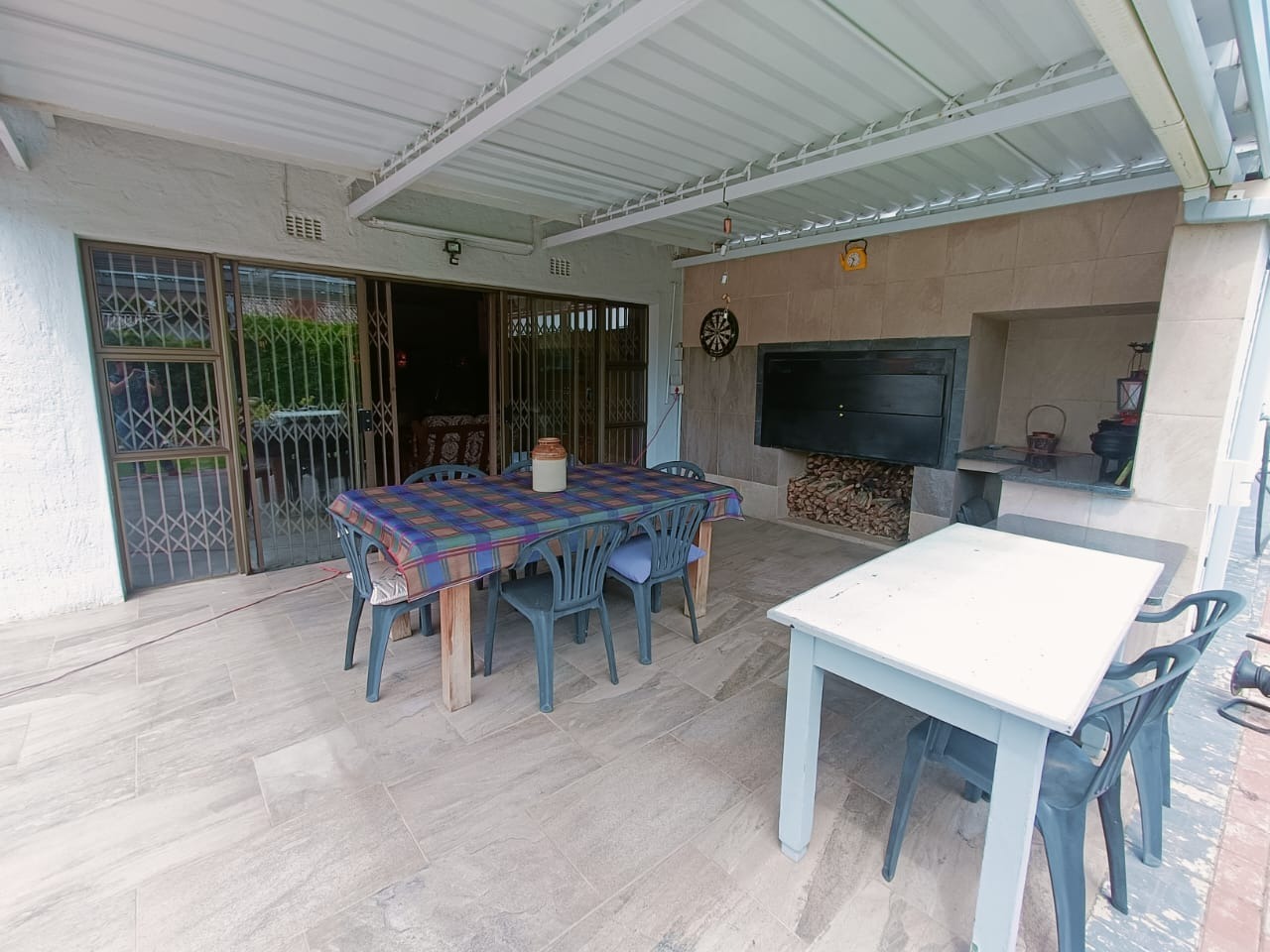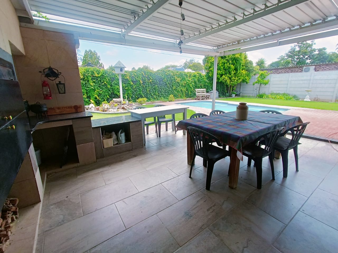 The lounge area opens onto a sunny braai area, overlooking a sparkling blue swimming pool, perfect for relaxation or entertaining guests.