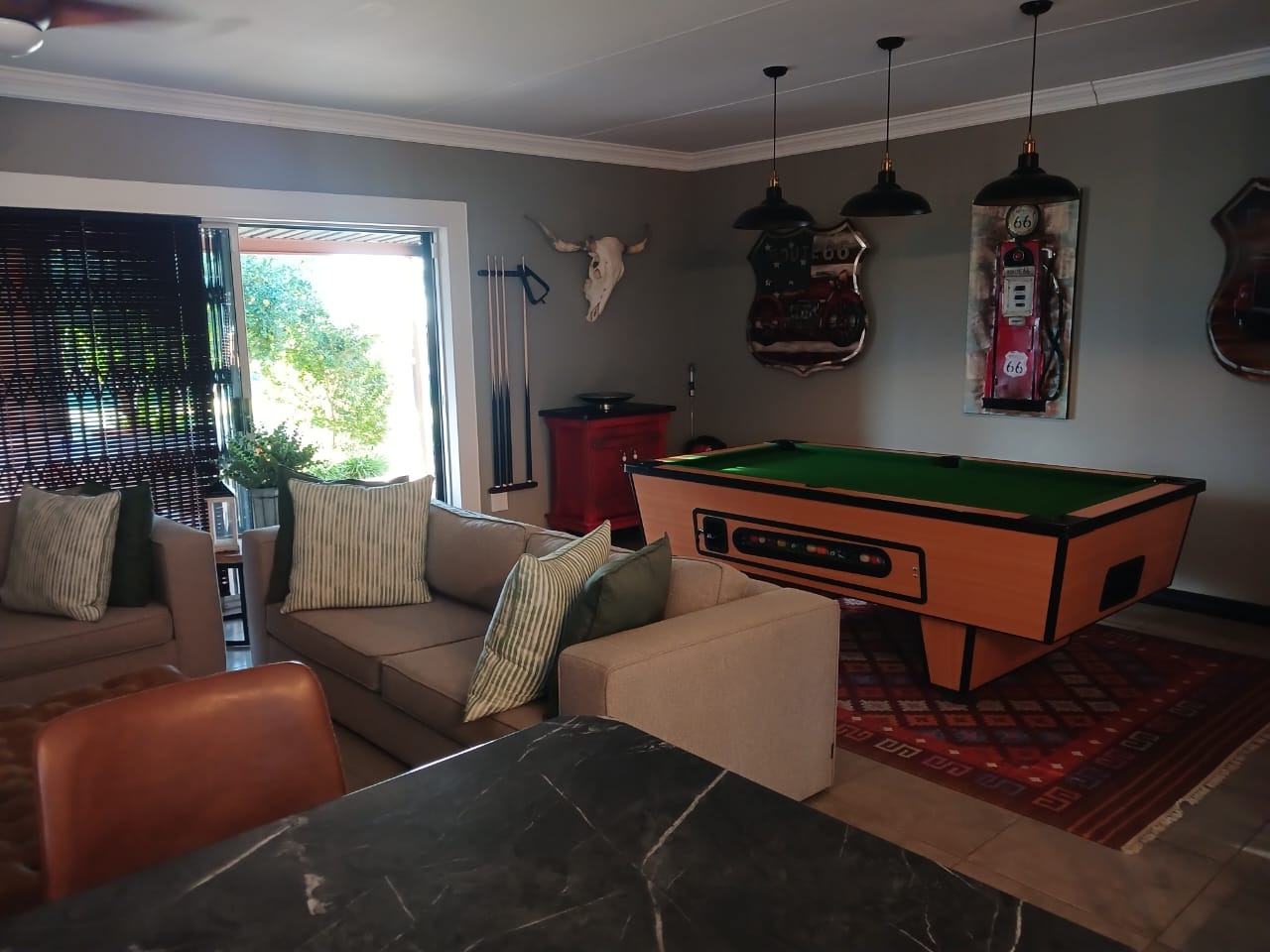 A very strong reliable borehole complemented by overhead irrigation, support both farming activities and the home's beautifully established garden, creating a lush and tranquil environment year round.